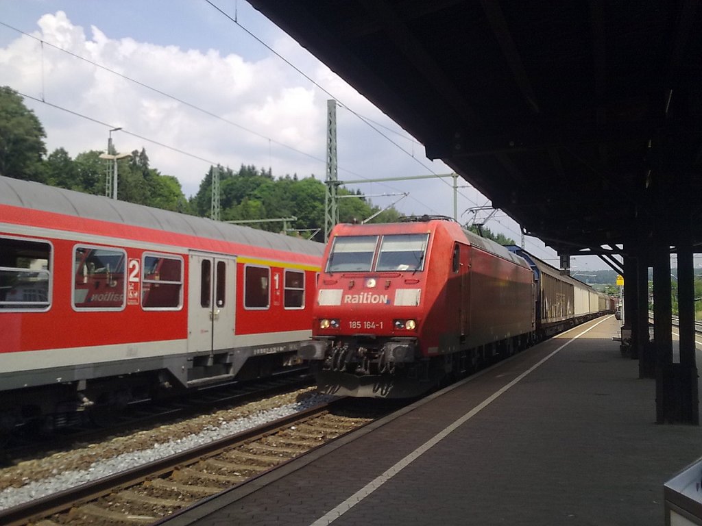 Die 185 164-1 durchfuhr am 30.6.10 mit gemischtem Güterzug den Bahnhof Kronach in Richtung Lichtenfels.