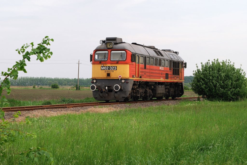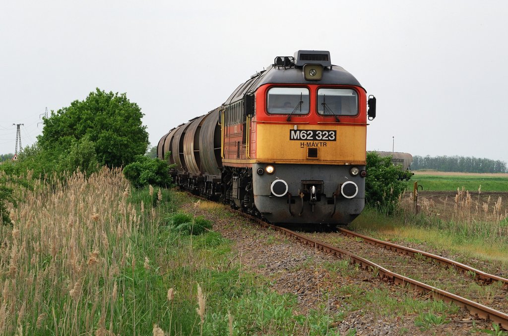 M62-323 mit Güterzug beim Anschluß 'Evonik Agroferm' in Kaba (05.05.2010)