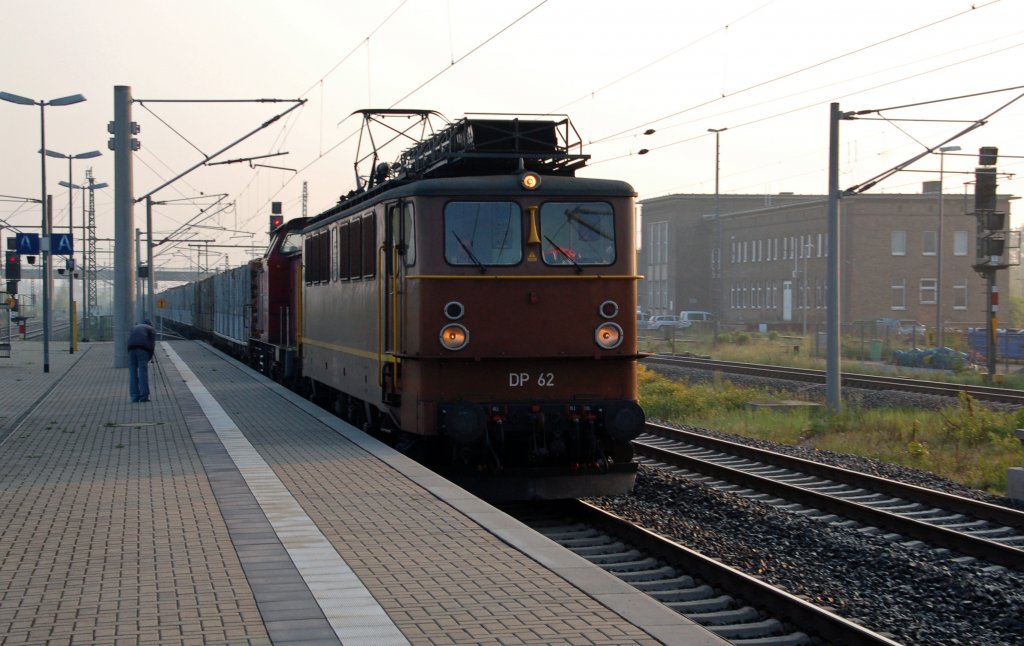DP 62 und eine Kubecon-V 100 fahren am 29.05.10 mit einem Holzzug durch Bitterfeld Richtung Halle oder Leipzig.