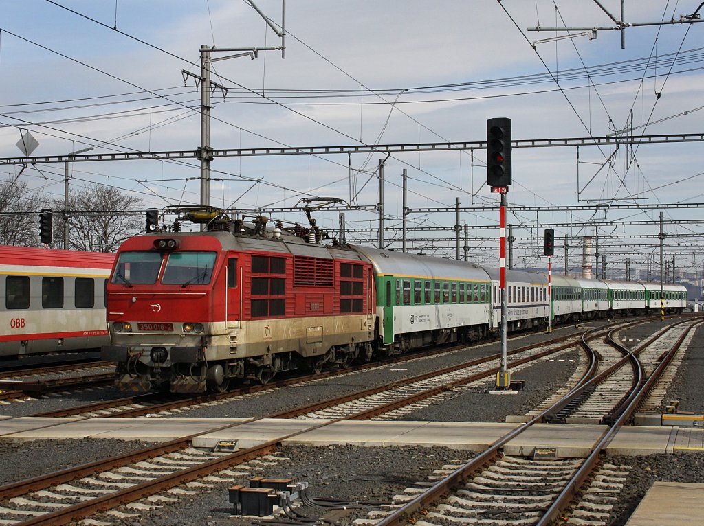 Die 350 016 am 03.04.2010 mit einem R bei der Einfahrt in Praha Hbf.