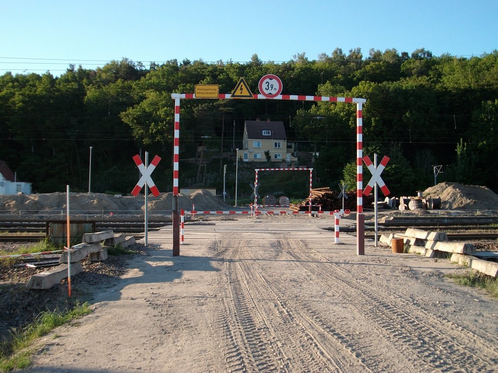 Provisorischer Baustellenüberweg in Lietzow.Das Öffnen und Schließen übernahm ein Sicherungsposten per Hand.Nach Feierabend blieben die Schranken die ganze Nacht geschlossen.