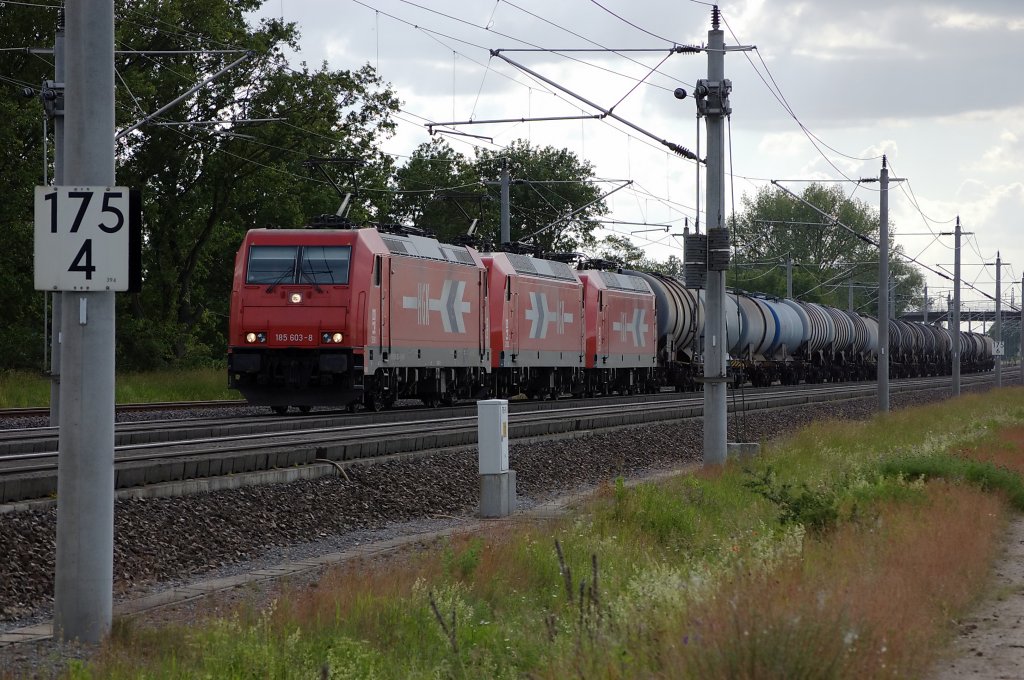 185 603-8 (HGK 2061) mit einem Kesselzug zwischen Großwudicke und Rathenow in Richtung Wustermark. Als Wagenlok die 145-CL 012 (HGK 2002) die mit gezogen hat und die 145-CL 011 (HGK 2001) kalt. 20.06.2010