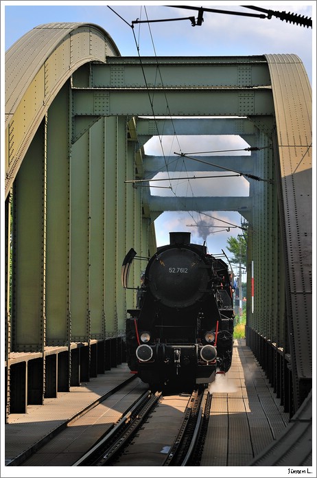 Die Dampflok 50 2740 in Riegel bei der Überfahrt der Dreisam. Die Lok ist einmalig hier, sie ist nur ausgeliehen, da der Rebenbummler mit Kesselschaden in Reparatur ist.