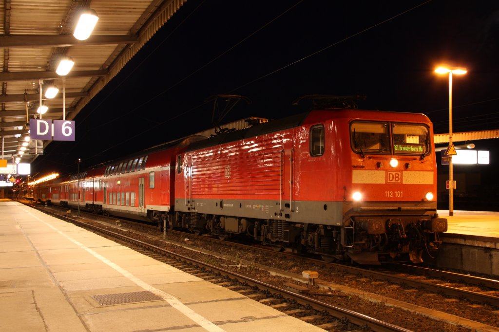 Tagsüber steht der RE1 aus Eisenhüttenstadt bzw. Frankfurt/Oder immer sehr fotografenunfreundlich auf Gleis 8 in Magdeburg Hbf. Um 23.17 Uhr fährt er allerdings von Gleis 7 (dann nur noch nach Brandenburg Hbf). Gezogen wurde er am 19.06.2010 von 112 101-1.