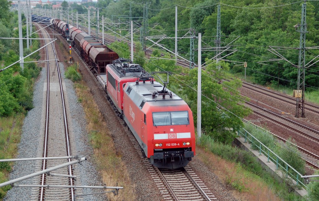 152 039 zieht am 20.06.10 einen Güterzug durch Holzweissig Richtung Leipzig. Im Schlepp hat sie eine BR 155.
