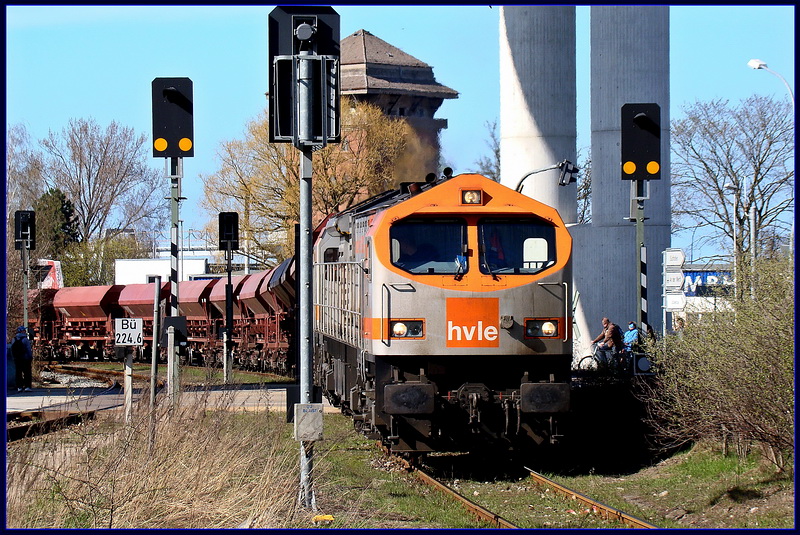 Bannig viele Signalmasten hier.;-) V330.1 am Bü Werftstraße (Zugangspunkt zum Nord-bzw Südhafen) in Stralsund. am 19.04.10