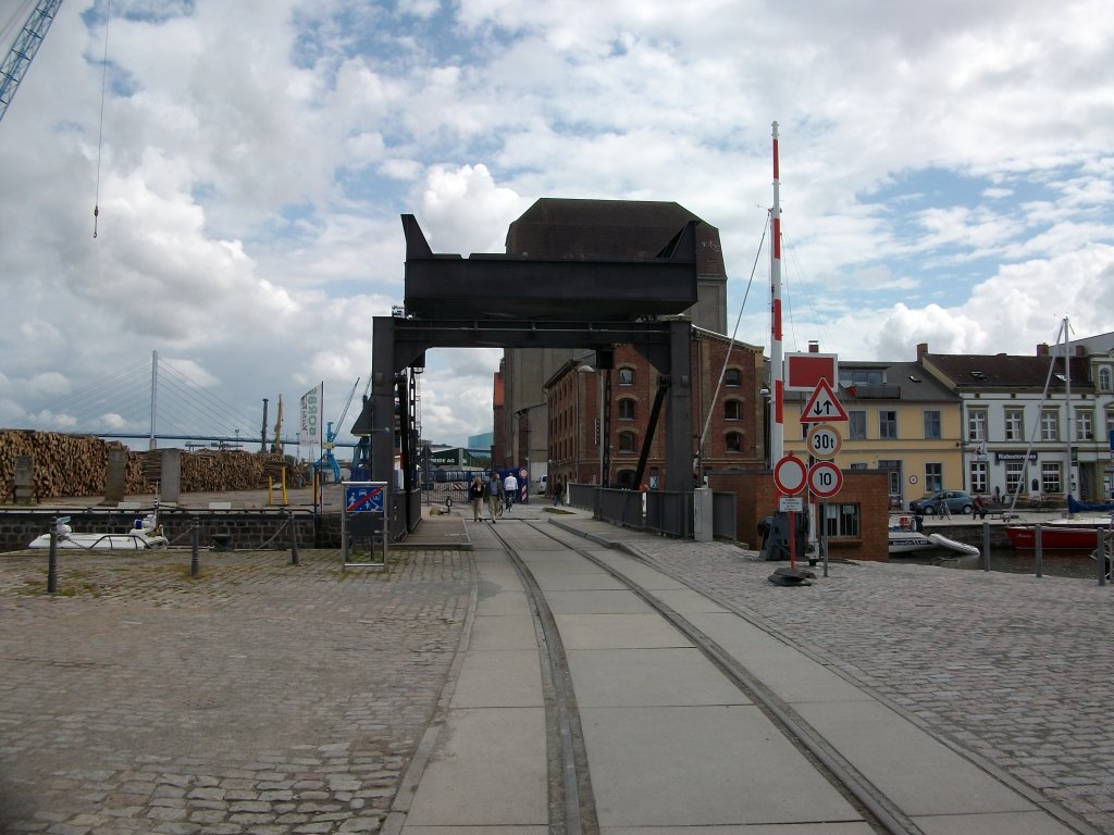 Klappbrücke im Stralsunder Hafen über die das Ausziehgleis vom Stralsunder Nordhafen führt und in der Nähe vom Stralsunder Ozeaneum endet.Auch zuerkennen rechts neben der Brücke ein Deckungssignal was Heute in Deutschland schon selten ist.