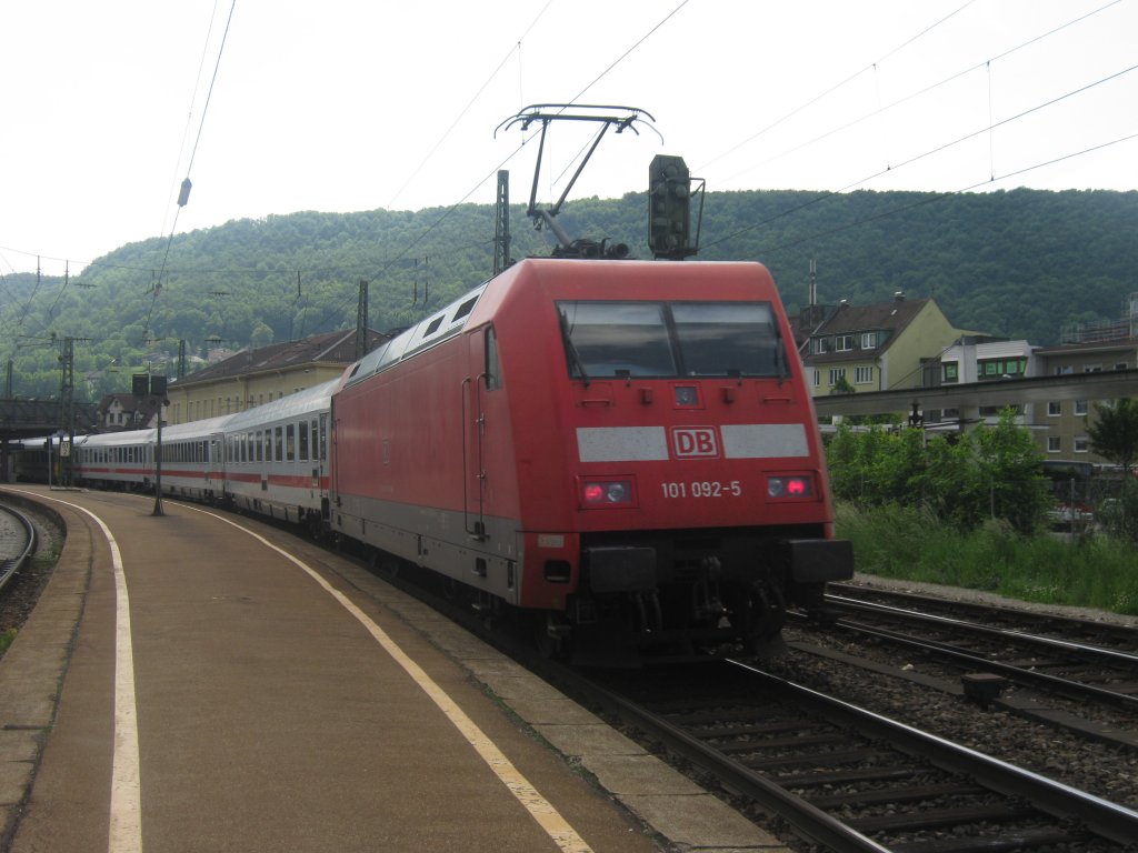 101-081 schiebt am 7.6.10 den IC 2260 nach Karlsruhe durch Geislingen (Steige). Die Lok müsste wohl mal gewaschen werden.