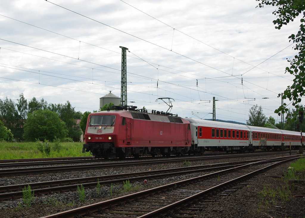 120 139-1 rast am Vormittag des 11.06.2010 mit leichter Verspätung und ihrem AZ Richtung Norden durch Eschwege-West.