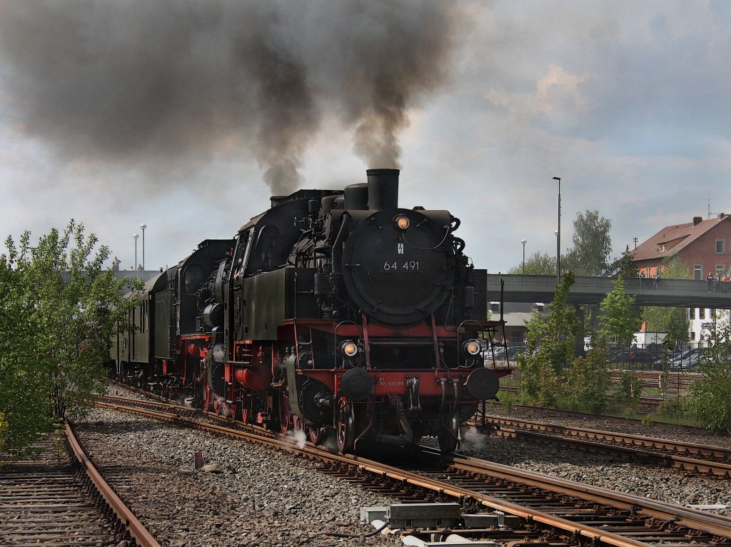 Die 64 491 und die 38 1301 am 22.05.2010 mit einem Pendelzug bei der Ausfahrt in Neuenmarkt-Wirsberg.