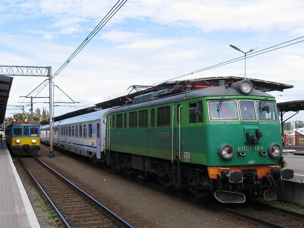 PKP EU07-158 mit einem Interregio aus Posen kommend bei der Einfahrt.