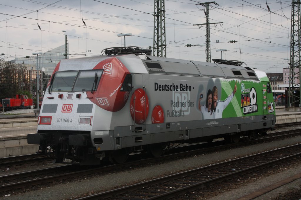 Wartend auf die nächste Leistung steht 101 040-4 "Fußball" im Nürnberger Hbf am 11.05.10.