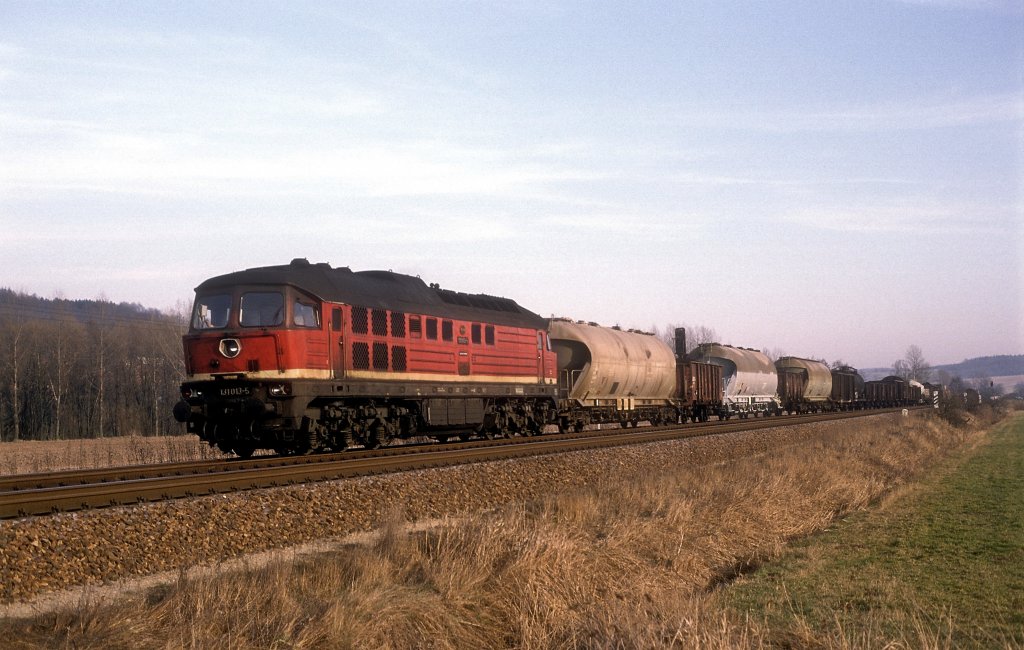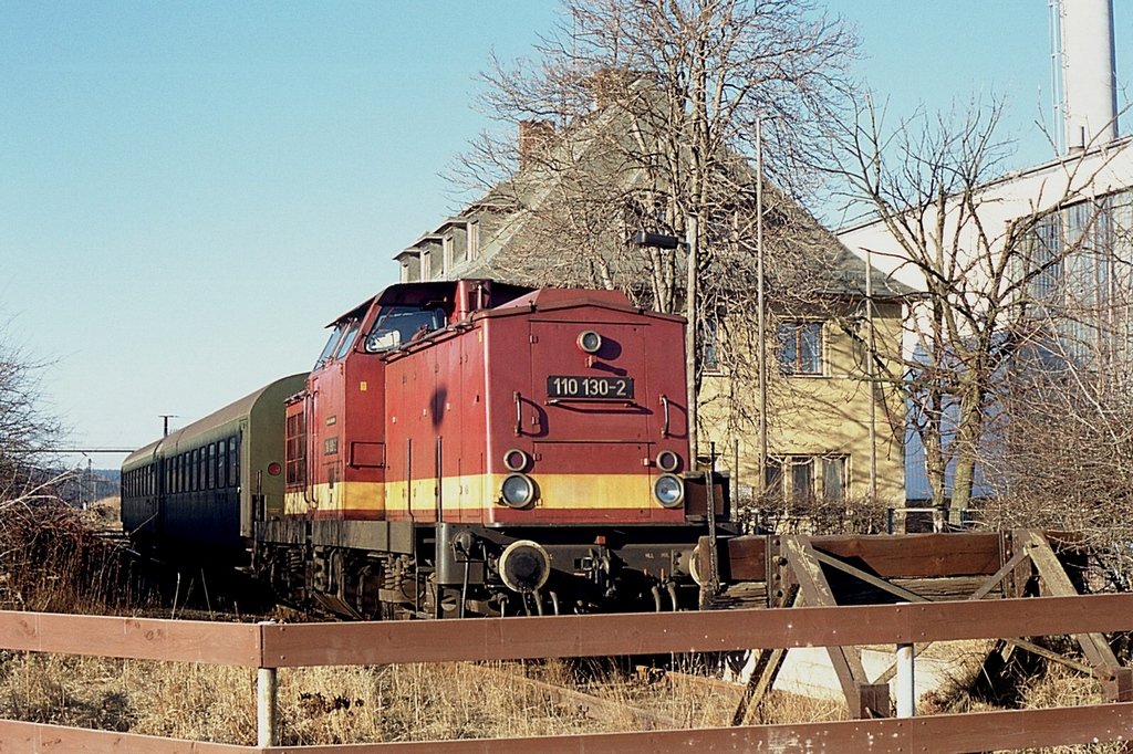 110 130 hat mit 16689 den Endbahnhof Saalburg erreicht, trotz vorhandener Pläne wurde hier nie weitergebaut, um die Strecke mit der Oberlandbahn zu verbinden. (31.01.1991, KB-Dia)