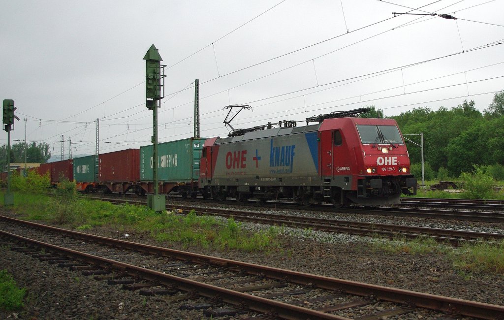 186 129-3 am frühen Morgen des 27.05.2010.mit Containerzug in Fahrtrichtung Süden durch Eschwege West.