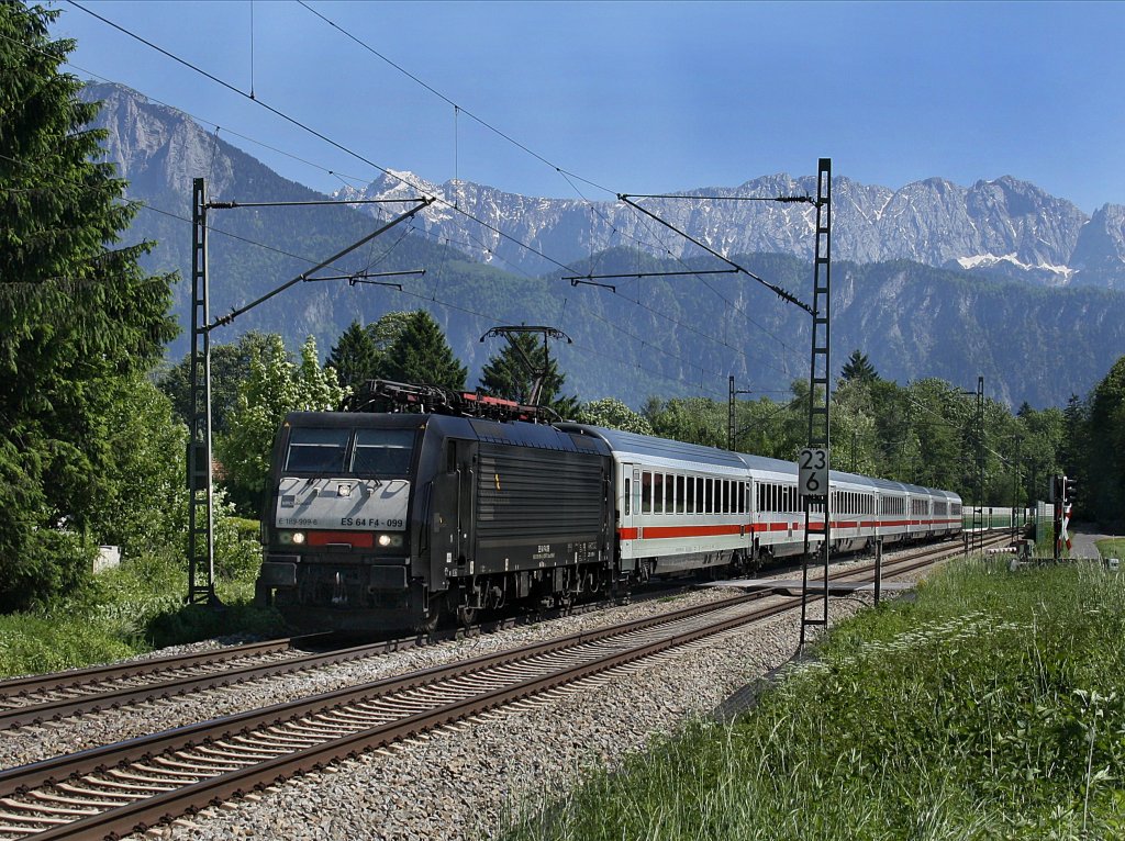 Die ES 64 F4-099 am 05.06.2010 mit einem Brenner EC unterwegs bei Niederaudorf.