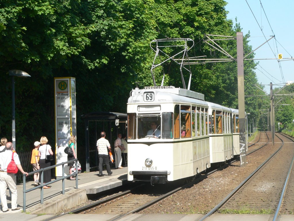 115 Jahre Karlshorst, 100 Jahre Straßenbahn in Karlshorst. Natürlich mussten diese Jubiläen auch auf der Schiene gewürdigt werden. DVN-Fahrzeug 217 055-8 am 5.6. nahe dem Krankenhaus Königin Elisabeth Herzberge. Leider etwas zu hell geworden.