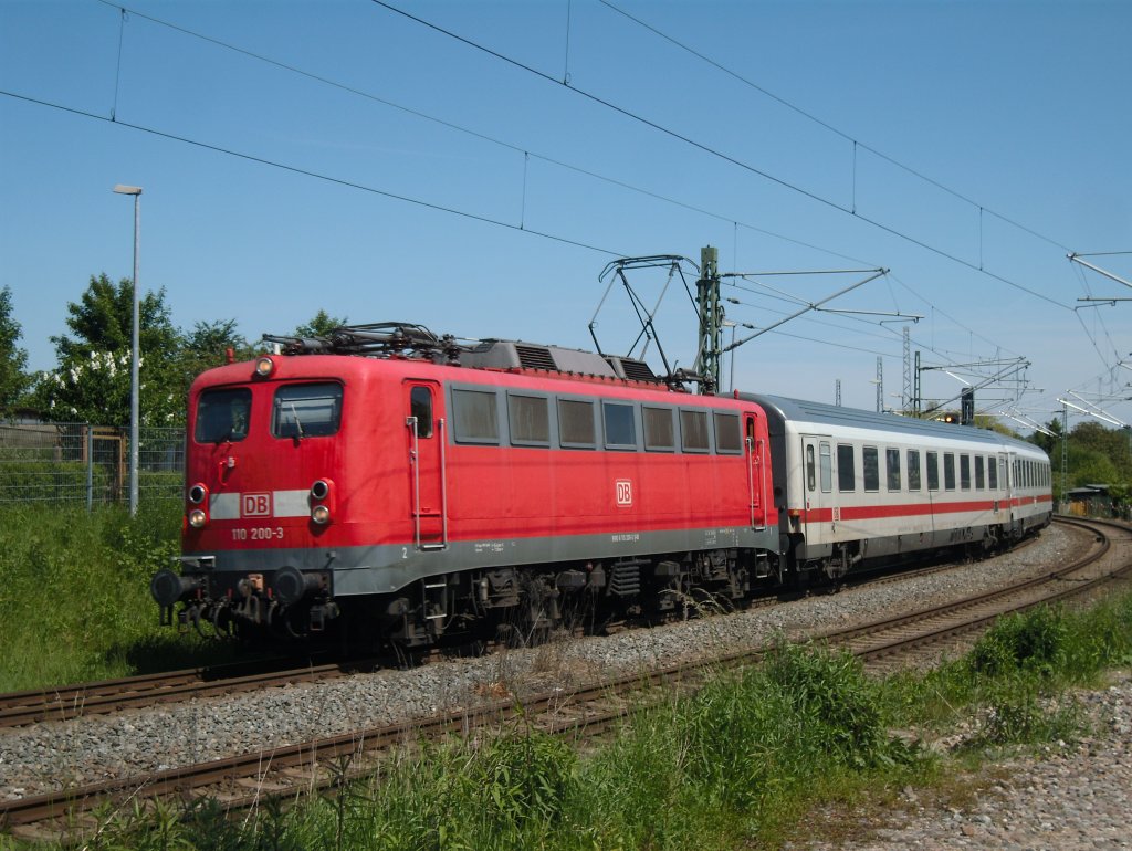 110 200 zog am 06.06.2010 den IC 1809 von Stralsund nach Rostock. Hier zu sehen in der Nähe des BÜ Dalwitzhofer Weg am gleichnamigen BW.