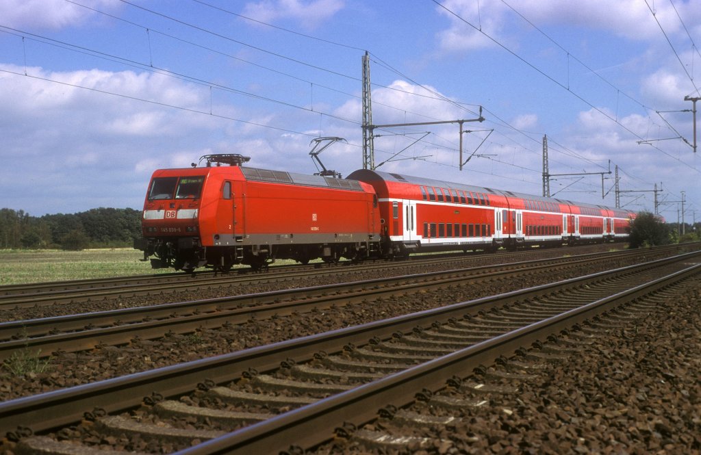 145 079-0 ist am 5.06.10 mit einem Containerzug bei Ramelsloh auf dem Weg Richtung Bremen.