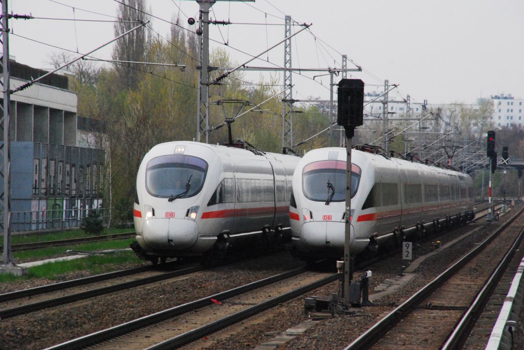 BERLIN, 13.04.2010, links ein ICE 3 auf der Ringbahn in Richtung Ostkreuz, rechts ein haltender ICE 3 in Richtung Gesundbrunnen nahe des S-Bahnhofs Landsberger Allee