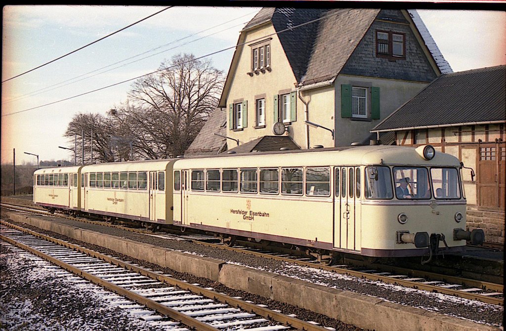 In voller Länge: VT 54, VM 56 und VS 55 als Gliedertriebwagen 1990 am Bahnhof in Schenklengsfeld. Die war eine seiner letzten Fahrten, bevor die Strecke eingestellt wurde.