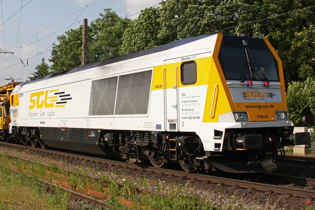 SGL V500.06 am 7.6.10 in Ratingen-Lintorf mit J.Hubert Bauzug der seit zwei Tagen in Duisburg-Bissingheim abgestellt stand
