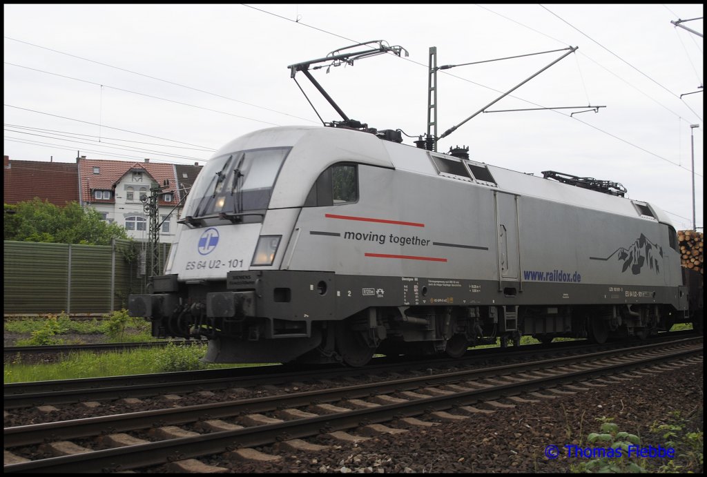 ES 64 U2-096 der TX Logistik hat am 5.06.10 einen KLV-Zug am Haken und durchfährt hier gerade Radbruch.