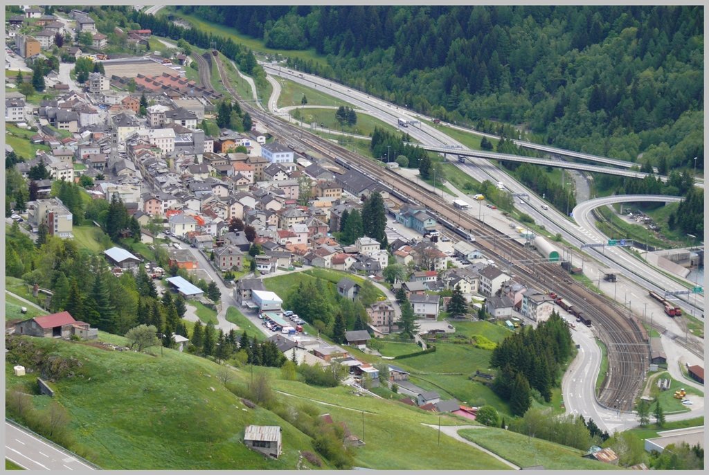Unterhalb von Airolo wechselt der ETR470 das erste Mal die Talseite. (03.06.2010)