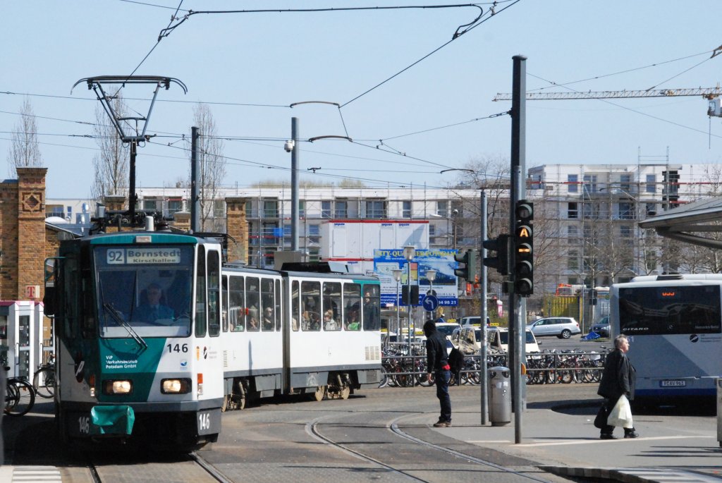 POTSDAM, 17.04.2010, Tramlinie 92 nach Bornstedt, Kirschallee, bei der Einfahrt in die Straßenbahnhaltestelle Hauptbahnhof