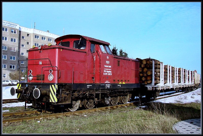 am frühen Sonntagmorgen ist Lok 6 -PBSV-(& natürlich auch die Besatzung) schon fleißig und bringt volle Holzwagen auf den Rügendamm. Stralsund am 28.02.10