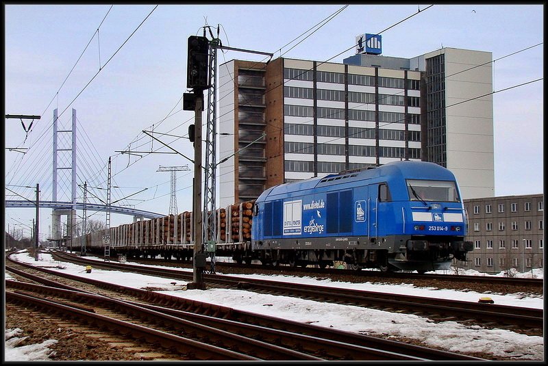 Kurz nach dem Mittag, holt 253 014-9  -Press- die Holzwagen vom Rügendamm ab. Stralsund am 28.02.10