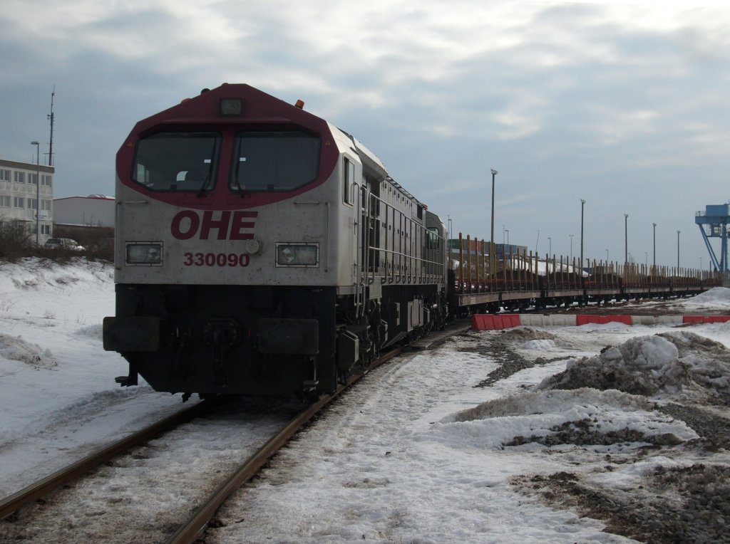 OHE-Tiger 330090 am 24.Februar 2010 mit leeren Holzwagen im Fährhafen Mukran.
