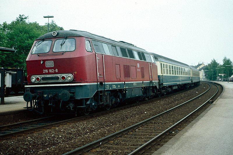 216 162-8 wurde im Sommer 1981 mit einem Schnellzug nach Köln, im Bf Fröndenberg aufgenommen.