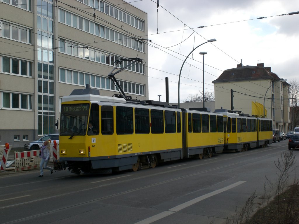 Berlin: Straßenbahnlinie 18 nach Hellersdorf Risaer Straße an der Haltestelle Betriebshof Lichtenberg.(8.3.2010)