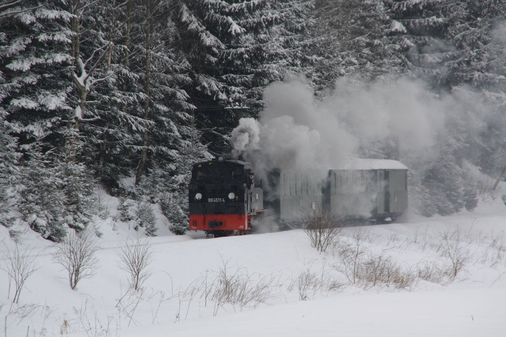 Teleaufnahme (200mm) von 99 4511, die am 13.02.2010 zwischen Schmalzgrube und Steinbach unterwegs war.