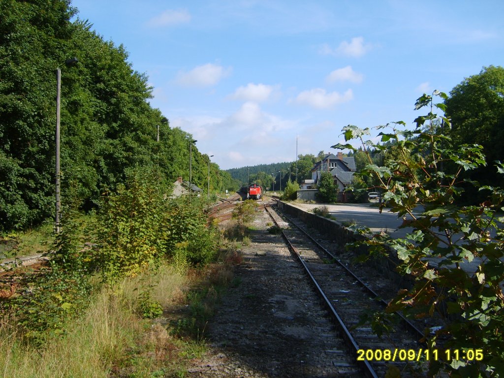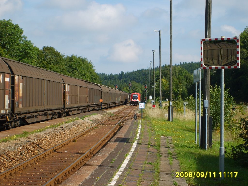 Bhf Wurzbach - Der Güterzug, übrigens mit Schiebelok, wartet im Kopfbahnhof die Kreuzung der Regionalbahn aus Blankenstein ab.