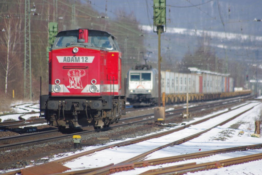 Nochmal ein Nachschuss auf Adam 12 "Rex". Im Hintergrund rollt schon der sonntägliche TXL-Zug heran. Aufgenommen am 07.03.2010 in Eschwege West.
