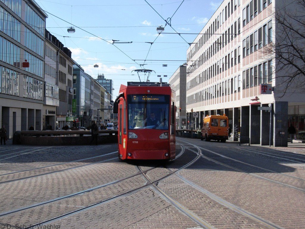 Wagen 0788 Typ ST14 als Linie 7 Richtung Arheilgen vor der Haltestelle Luisenplatz. Fotografiert am 04.03.2010