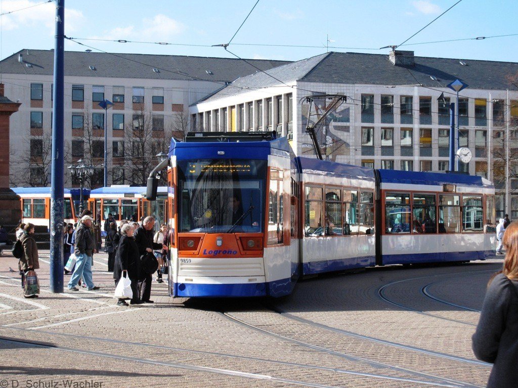 Wagen 9859 (Logrono) Typ ST13 als Linie 3 Richtung Lichtenbergschule an der Haltestelle Luisenplatz. Fotografiert am 04.03.2010