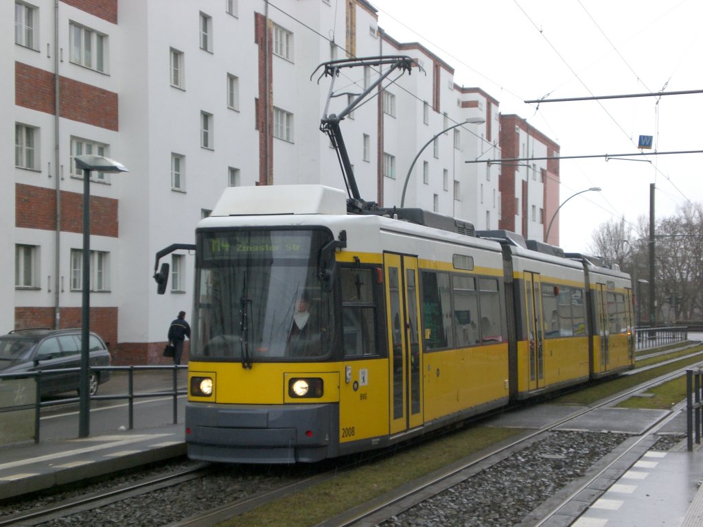 Berlin: Straßenbahnlinie M4 nach Hohenschönhausen Zingster Straße an der Haltestelle Weißensee Buschallee.(14.3.2010)