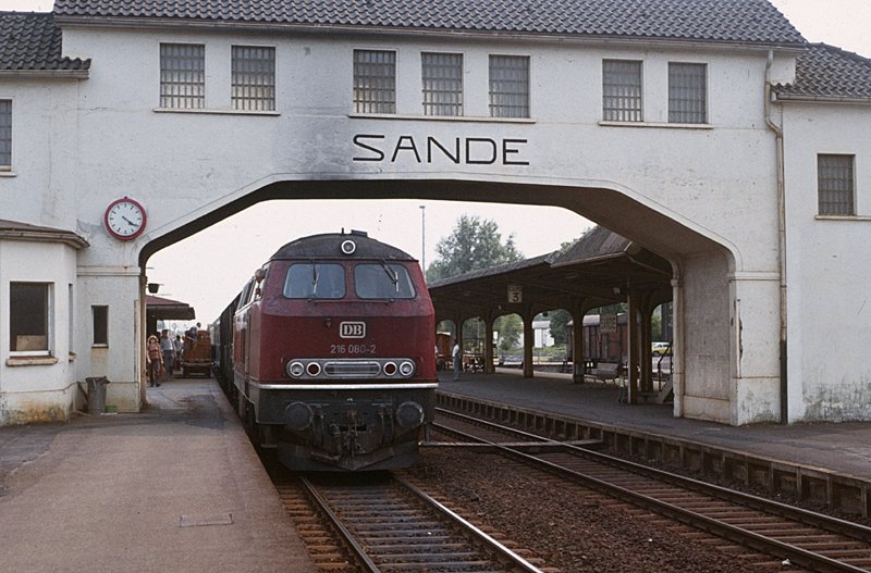 Dieses Bild zeigt die 216 080-2 im Sommer 1982 im Bf Sande.