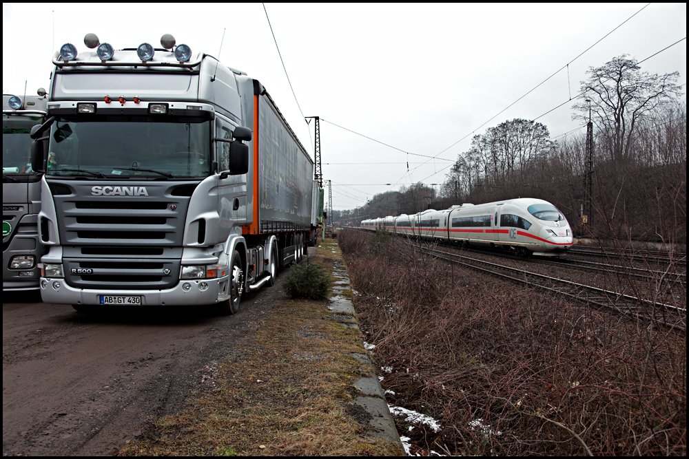KING OF THE ROAD vs ICE3 in Laufach. Während der SCANIA TOPLINE R500 \8/, natürlich mit Sidepipe :-P, seine Kraft aus einem 16 Liter V8 Motor schöpft, bringt der ICE3 eine Dauerleistung von 8000 kW auf die Schienen. Hier durchfährt ein 403er als ICE 625, Hamm(Westf) - München Hbf, den Bahnhof Laufach. (14.03.2010)