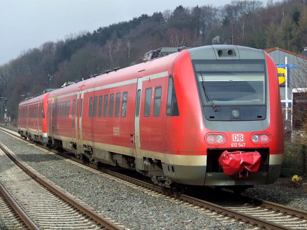 Eine Doppeleinheit 612 verlässt am 16.03.2010 den Bahnhof Fröndenberg im Ruhrtal in Richtung Hagen als RE 17.