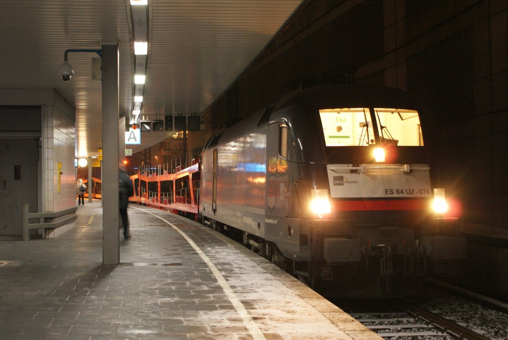 ES 64 U2-074 mit einem Autozug in Düsseldorf Hbf am 12.02.2010 um 19:13 Uhr