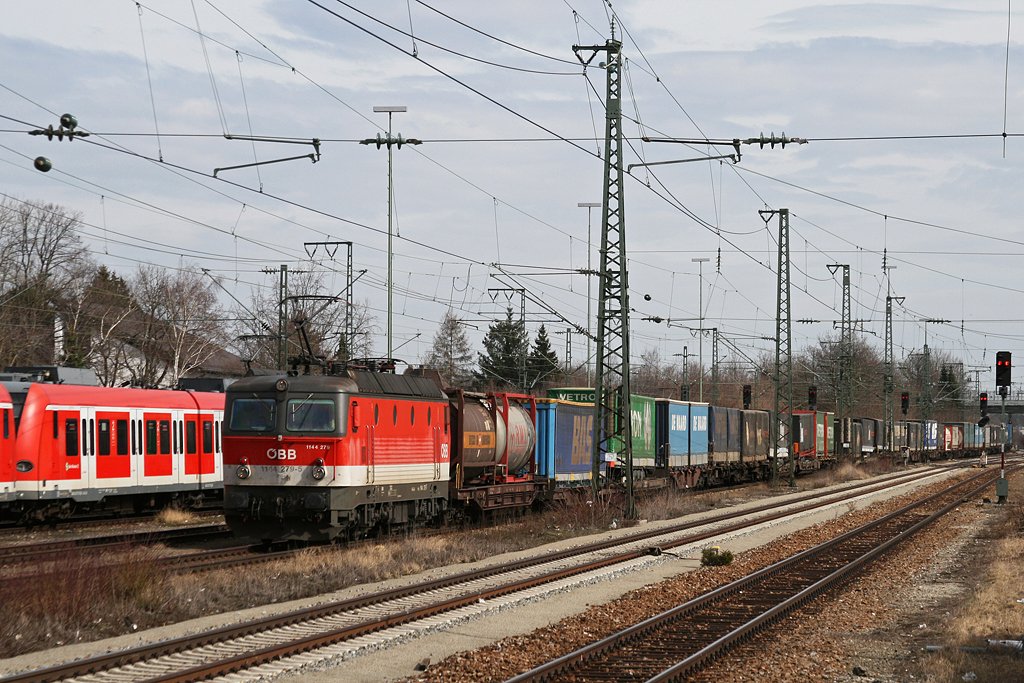 Die 1144 207 mit einem Güterzug am 13.03.2010 bei der Durchfahrt in Aßling.