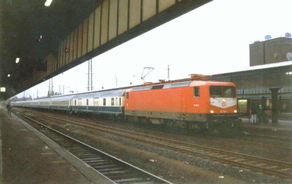 Alltägliches Erscheinungsbild in Oberhausen,einige Jahre nach der Wende.. BR112 mit Postwagen und den typischen Abteilwagen im Schlepptau.. (1993)