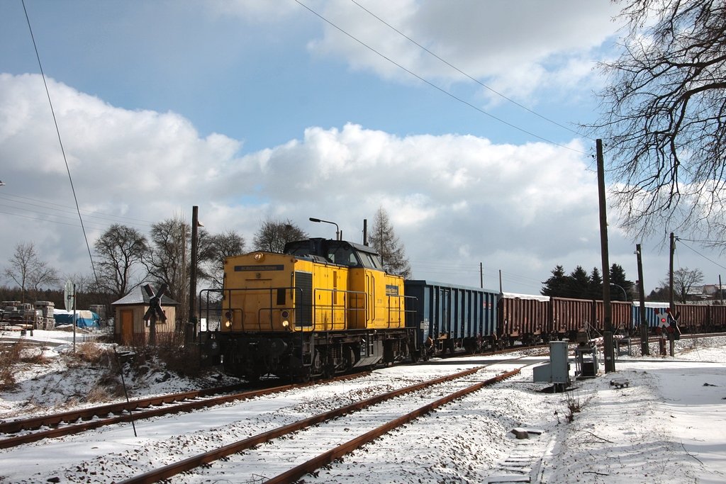 Am 05.03.2010 durchfährt 203 728 (9280 1203 135-9 D-SWT) der SC Rail Leasing Europe, eingstellt beim Verkehrsunternehmen Stahlwerk Thüringen, mit DGS48340 (XTCH - UKZ) den Bf Pöllwitz an der KBS546.