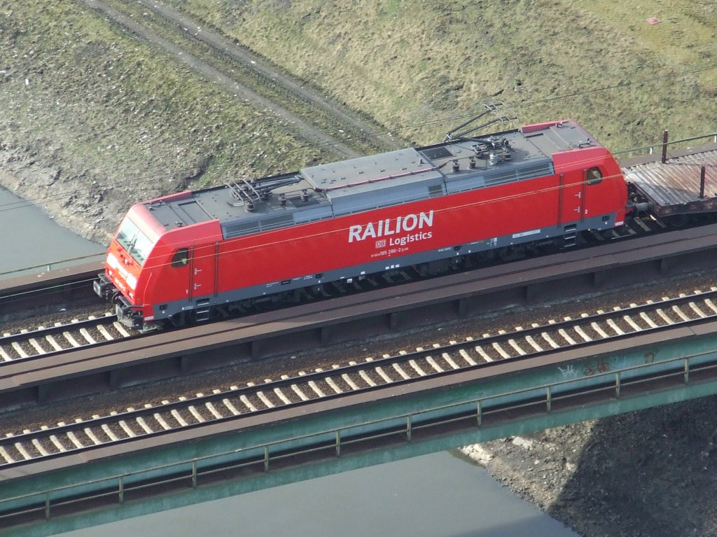 DB 185 286 überquert am 18.03.2010 den Rhein-Herne-Kanal in der Nähe vom Oberhausener Gasometer in Richtung Süden.