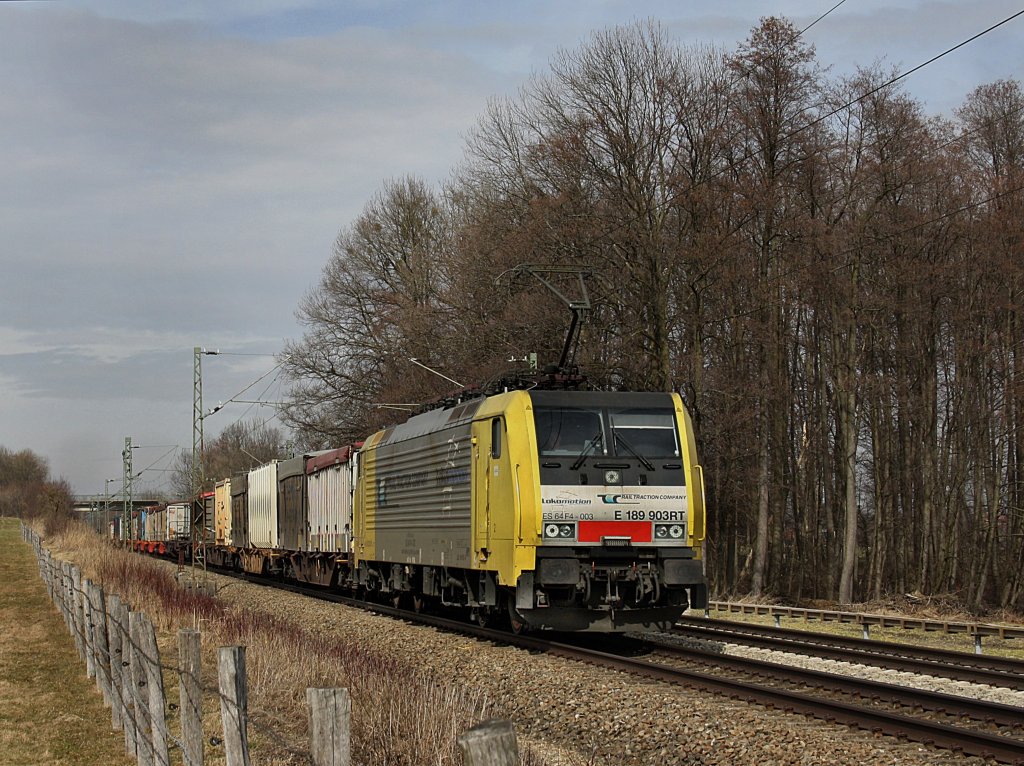 Die ES 64 F4-003 mit einem KLV-Zug am 20.03.2010 unterwegs beim BÜ Vogel.