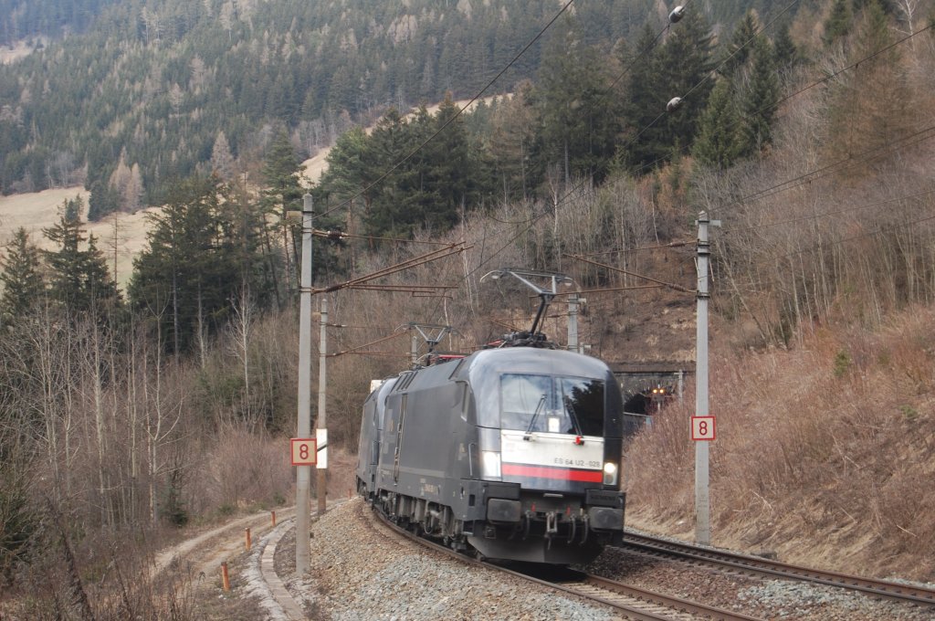 ES 64 U2 - 028 und ihre Schwester ES 64 U2-005 ziehen eine RoLa zum Brenner, hier kurz nach Verlassen des Schönbergtunnels. Nachgeschoben wurde dieser Zug von der "Transped"-185, 185 526. 21.3.2010