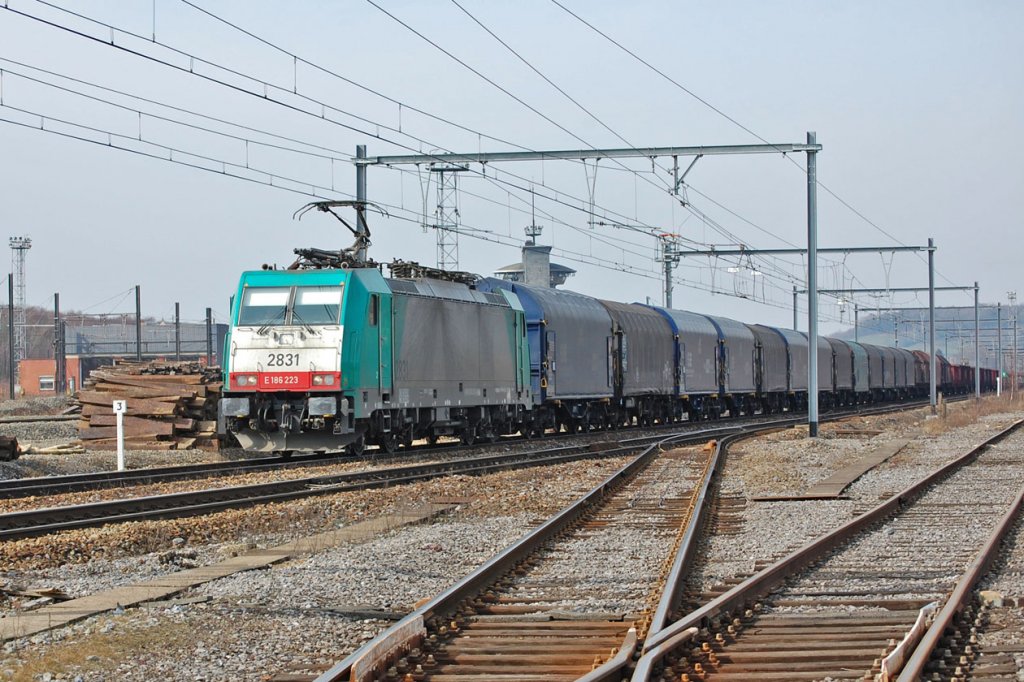 189 205-8 mit einem Ganzzug Transcereales Getreidewagen. Der Zug kommt aus Richtung Braunschweig. Fotografiert am 21.03.2010 in Magdeburg Diesdorf.